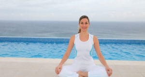 Woman doing exercises by a swimming-pool